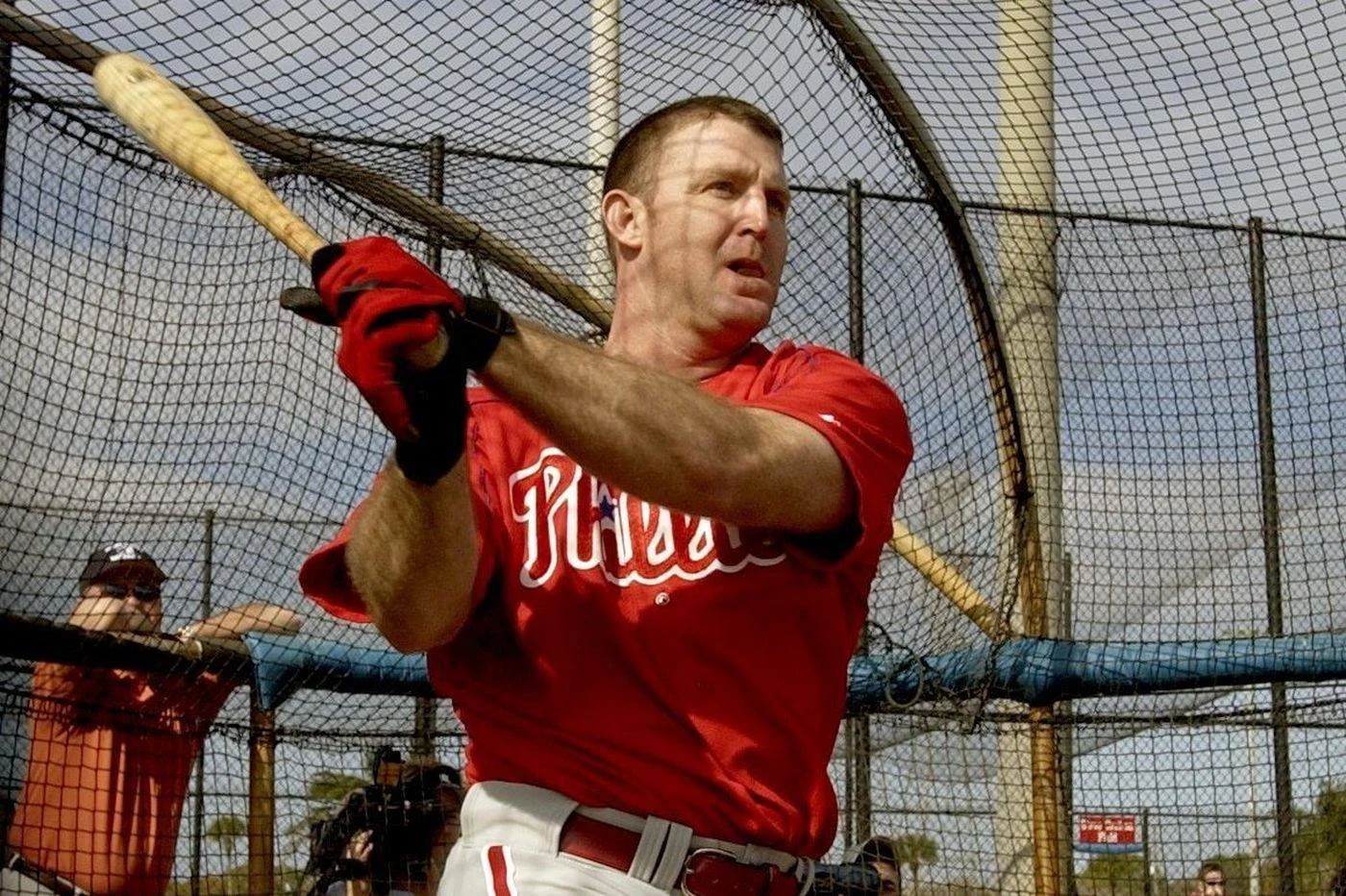 Future Hall of Famer Jim Thome during batting practice with the Philadelphia Phillies in spring training 2003. Thome ends up in 2003 leading the major leagues with 47 homers along with a career-high 131 runs batted in.