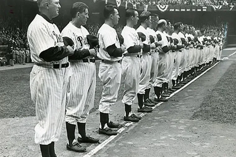 The Philadelphia Phillies, donning their new red pinstriped uniforms, line up along the third-base foul line 76 years ago today before opening the 1950 season with a 9-1 victory over the Brooklyn Dodgers at Shibe Park. The victory before a Tuesday afternoon crowd of 29,074 is the first of 91 that season for the Phillies, who win the National League pennant before falling to the New York Yankees in a four-game sweep of the 1950 World Series.