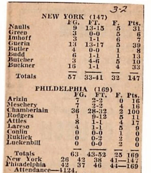 Yet, for one night – 62 years ago tonight, in fact – Chamberlain is wildly cheered in Hershey, Pa., as he scores a single-game, NBA record 100 points in the Warriors’ 169-147 victory over the New York Knicks before a crowd of 4,124 at Hersheypark Arena.
