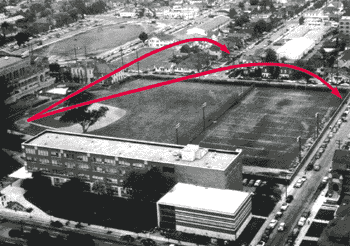Mantle’s first home run – the one traveling 656 feet – leaves USC’s baseball field before sailing over the width of the adjoining practice football field beyond right field and coming to a stop.