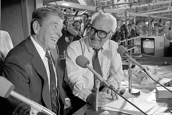 Hall of Fame broadcaster Harry Caray on sharing a broadcast booth in 1988 with onetime baseball radio announcer and then-President Ronald Reagan: