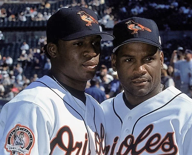 Tim Raines joins his son, Tim Raines Jr., in the outfield 24 years ago today during the Baltimore Orioles’ 5-4 loss to the Boston Red Sox before a Thursday night crowd of 43,302 at Camden Yards.