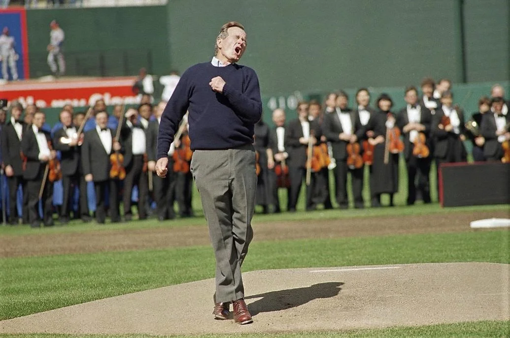 President George H.W. Bush delivers the first pitch