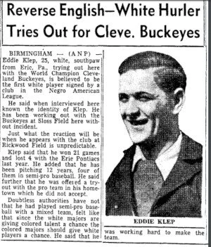 “Ernie had the foresight to take a White ballplayer,” onetime Kansas City Monarchs catcher Sammy Haynes decades later tells Washington Post columnist Steve Moore, “knowing that sometimes (Klep) would be denied a chance to play and that it would draw a bigger crowd if they had some excitement.”